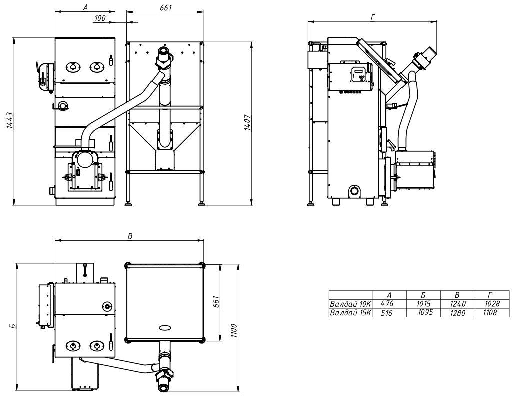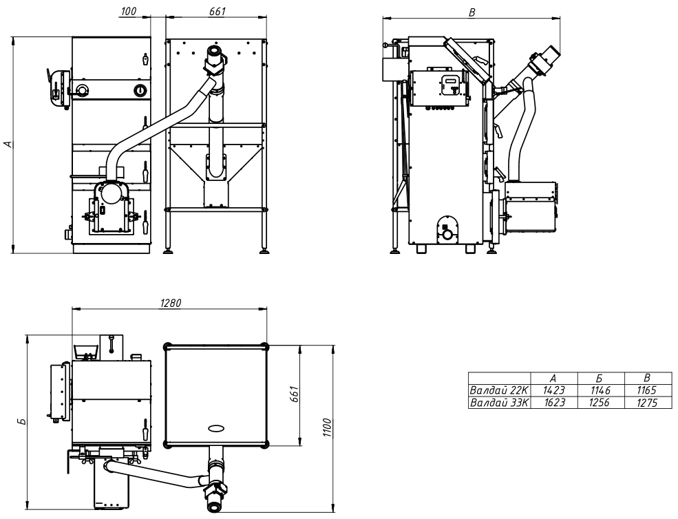 Габаритные и присоединительные размеры котлов Валдай К 10, 15, 22 и 33 кВт с горелкой и блоком управления.