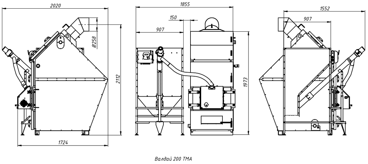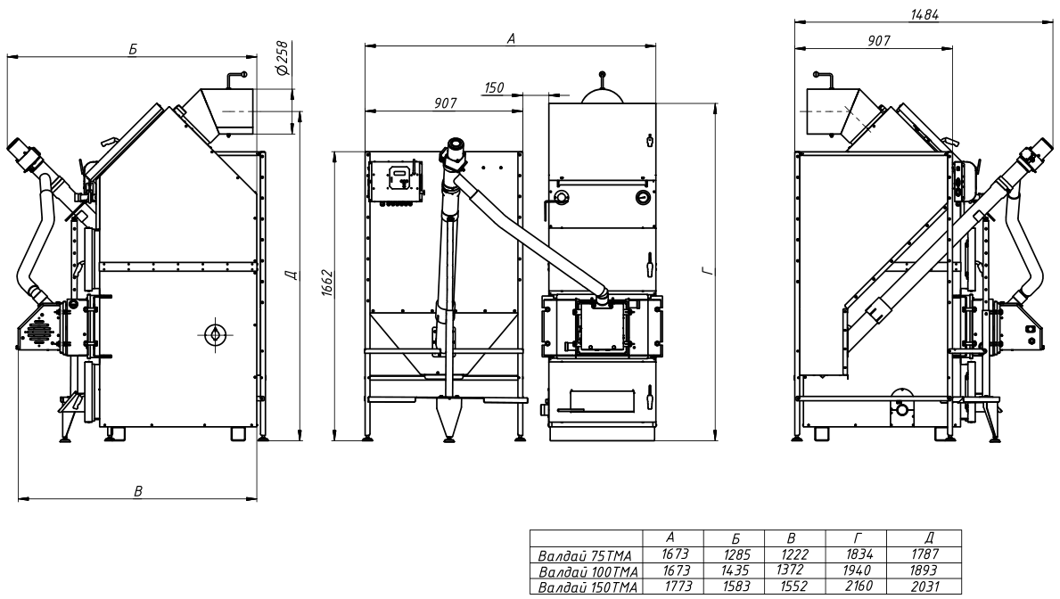 Габаритные размеры котлов Валдай ТМА 75, 100 и 150 кВт с горелкой РВ и бункером