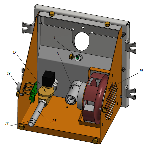 10 — вентилятор, 11 – устройство поджига, 12 – клапан продувочный, 13 – штуцер подвода сжатого воздуха, 19 – электрический разъем, 3 – фотоприемник, 25 – трубопровод сжатого воздуха, 21-коллектор продувочный, 22 – стойка, 23 – регулировочный болт.
