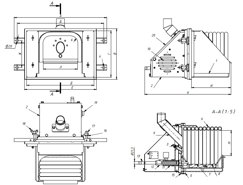 | Габариты бункера в сборе с блоком управления и податчиком пеллет ШхДхВ, мм | 907х1574х1662 | ||