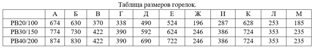 | Габариты горелки ВхШхД, мм | 442х674х628 | 472х774х724 | 472х874х724 |