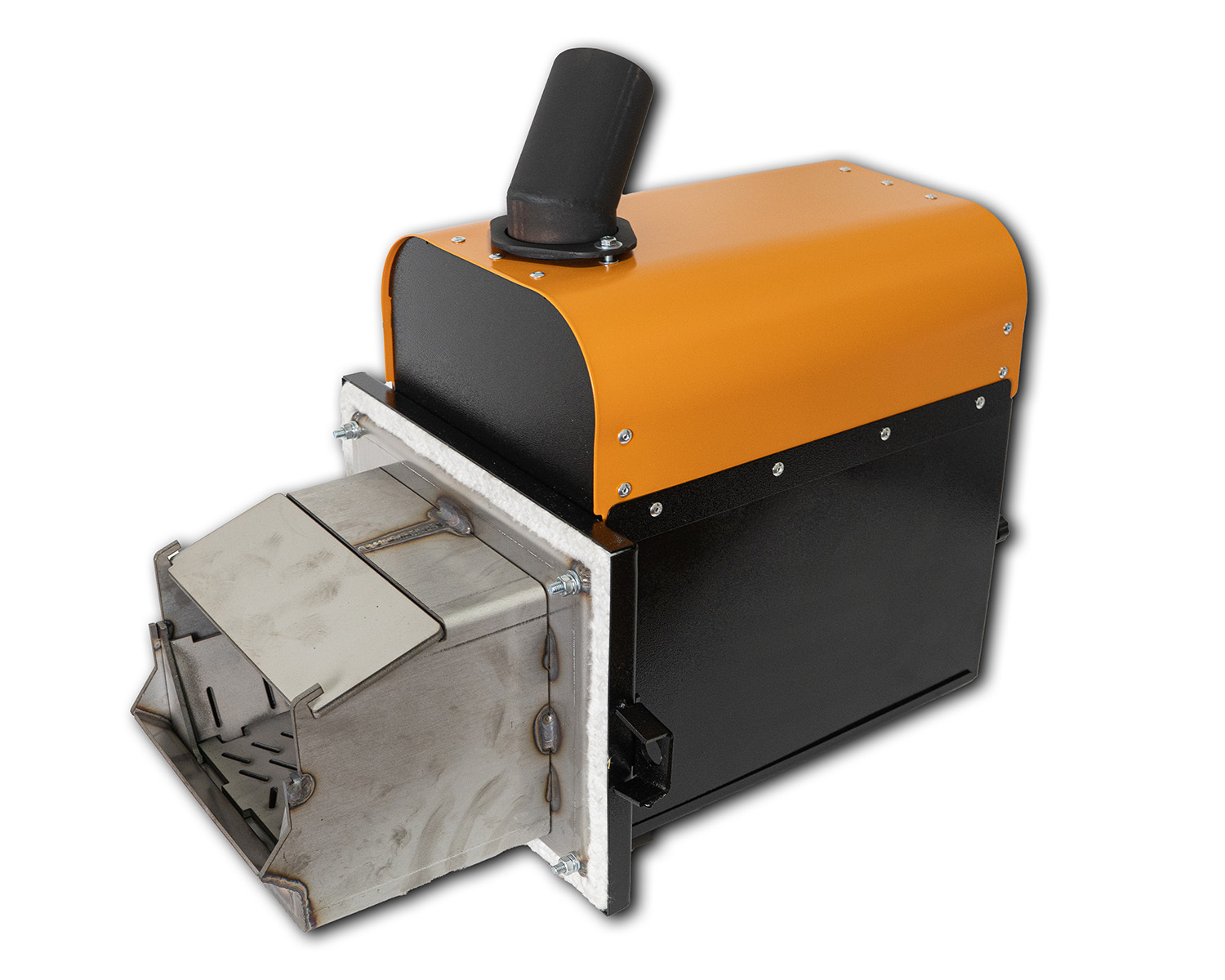 Корпус пеллетной горелки. В корпусе находятся камера сгорания с колосником, устроенные так, чтобы обеспечивать максимальный КПД работы котла (до 92%). В корпусе также закреплены вентилятор, устройство поджига и фотоприемник, позволяющий наблюдать за горением пеллет. В моделях линеек PB и PB 20-200 предусмотрена возможность пневматической отчистки камеры горелки в автоматическом режиме, без контроля человеком. В горелках BC4/35, BC10/50 отчистка колосников производится механически, с помощью поршня.